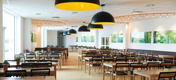 Vår fina och trevliga lunchrestaurang ligger i anslutning till mässhallen med modern inredning inspirerad av Skånes vackra bokskogar. -